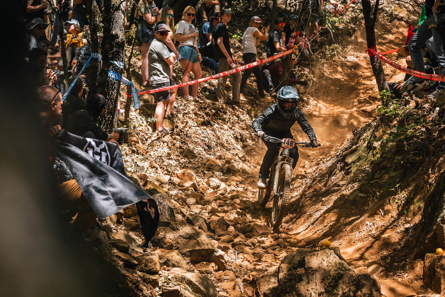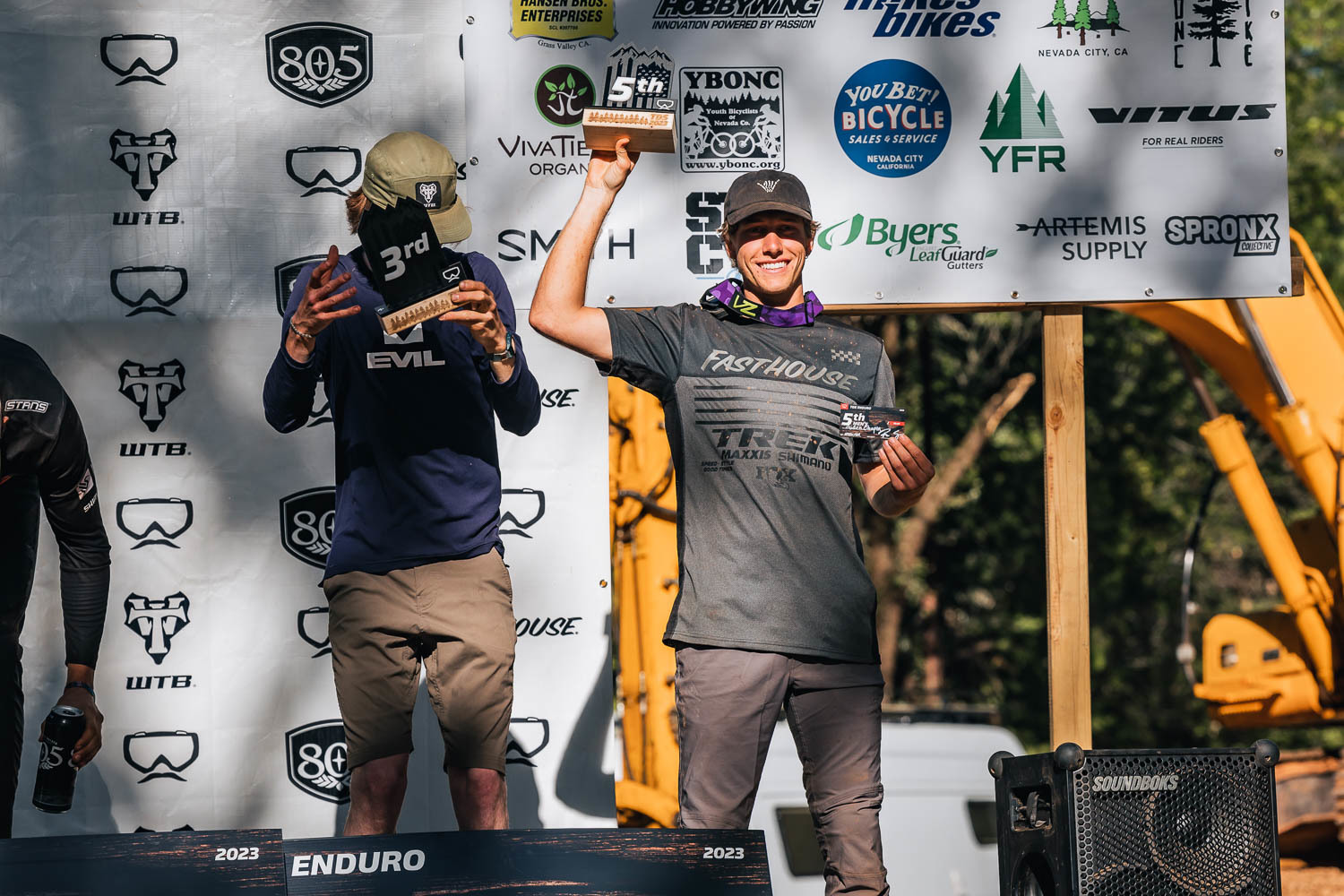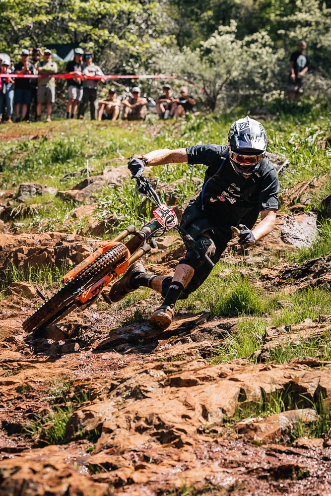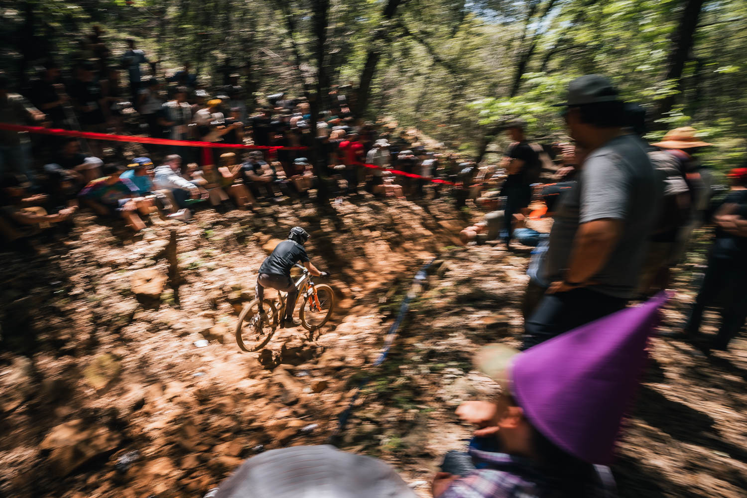 The heckling is world class and you can’t help but get sucked into the shared experience of cheering on your best buds or idols flying between the pines. The Sanchez family and the awesome volunteers work endlessly on crafting a trail system unlike any other. The course has its steep sections, rock gardens, jump lines, bomber turns, gnarly pedal sections, and even a huge long-jump spectacle. This whole property is not for the average rider. It is intense, technical, and fast. If you want to come close to the top 5 you have to send it and keep it on two wheels.